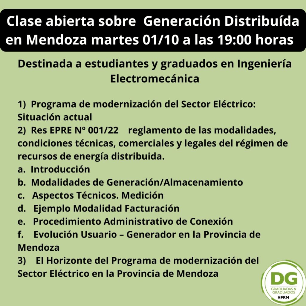 Dentro de la actividad curriculares de las Asignaturas Redes de Distribución e Instalaciones Eléctricas y la de Centrales y Sistemas de Transmisión de la FRM – UTN, se dará una clase abierta con la temática de Generación Distribuida en la Provincia de Mendoza.