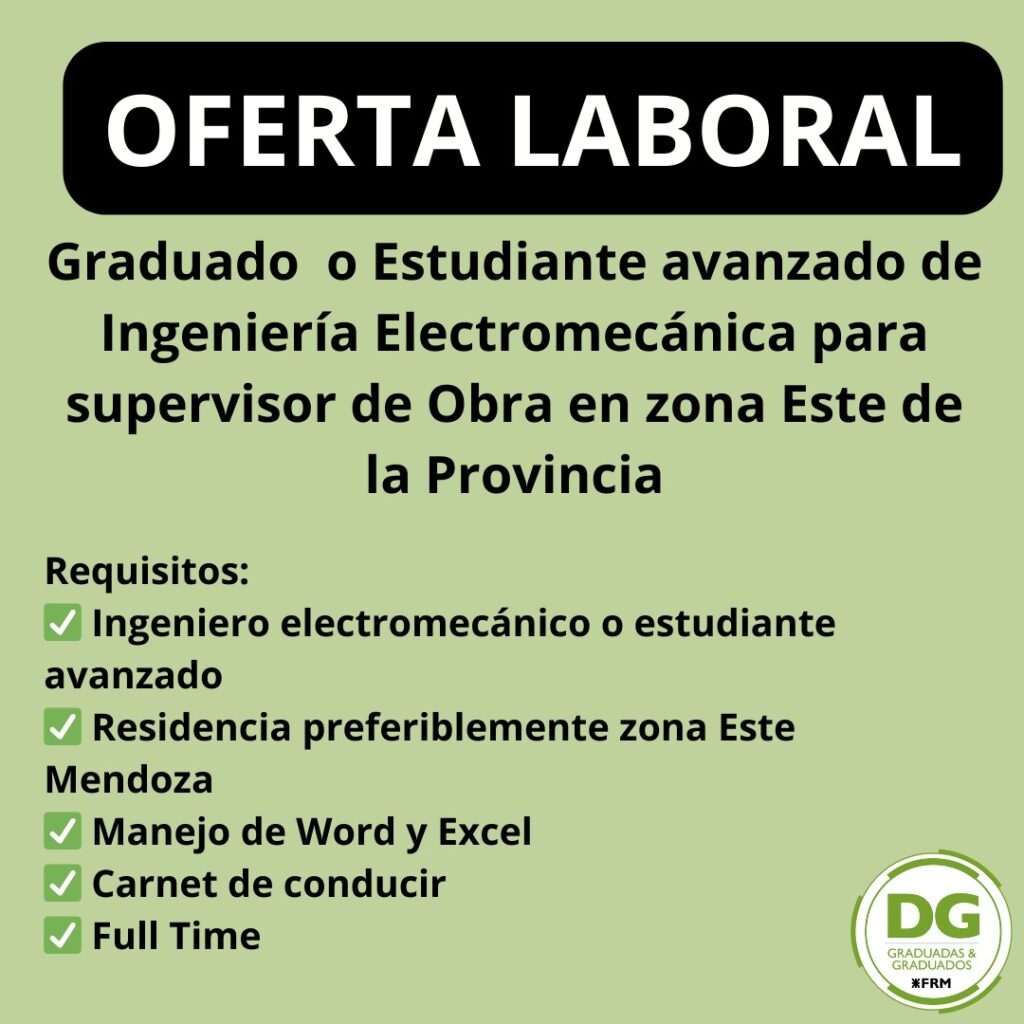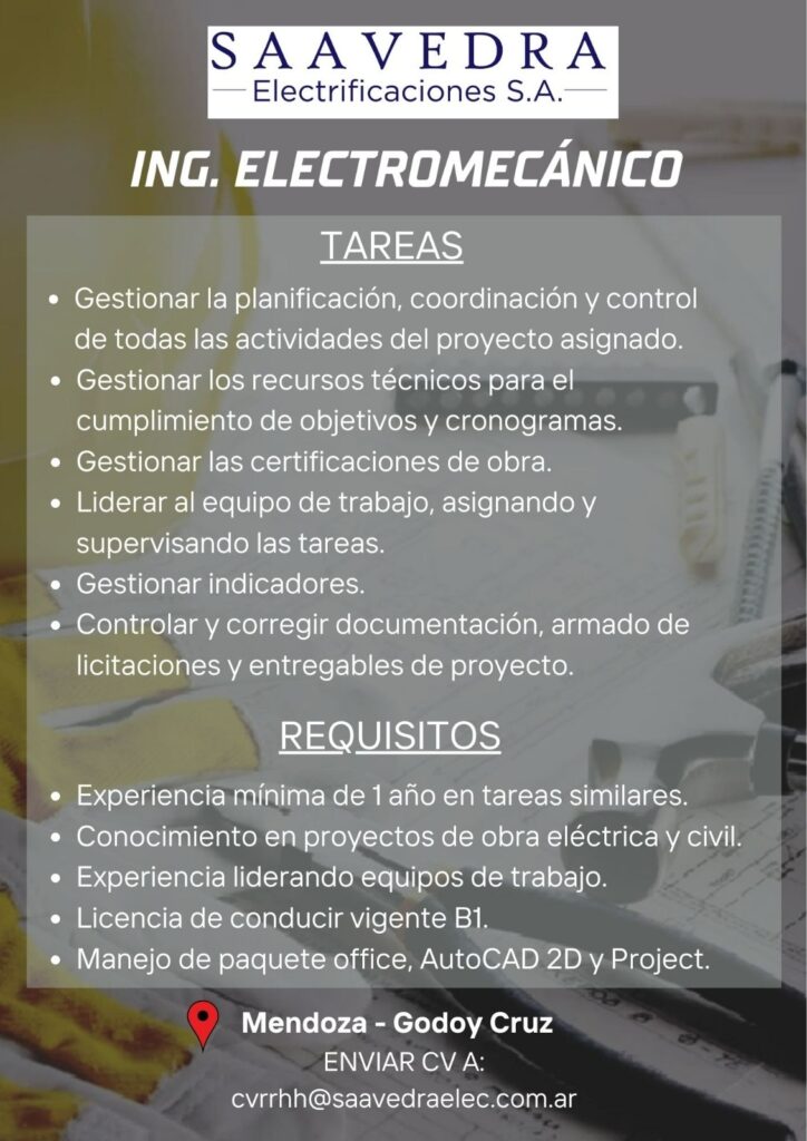 #TrabajoElectromecanico – ING. ELECTROMECANICO O AVANZADO PARA SUPERVISOR DE OBRA.