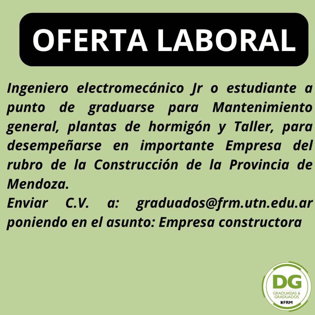 Oferta Laboral para Ingeniero Electromecánico o estudiante a punto de recibirse para trabajar en importante Empresa Constructora del medio