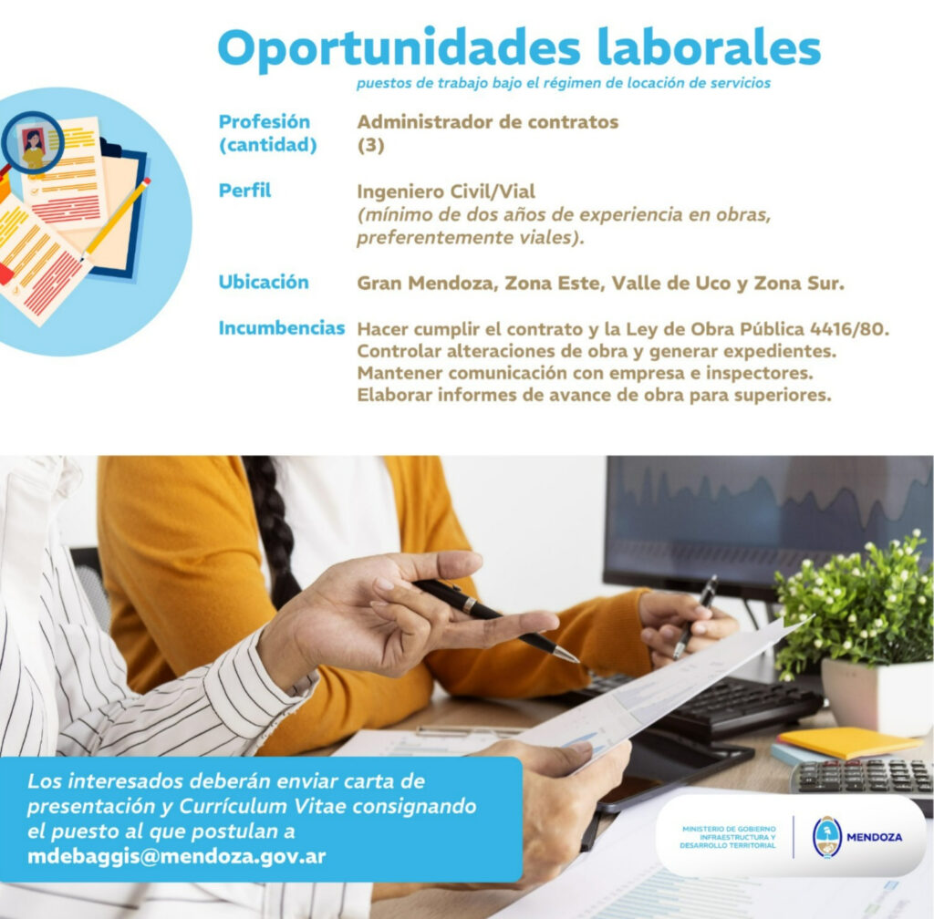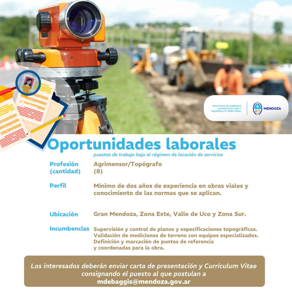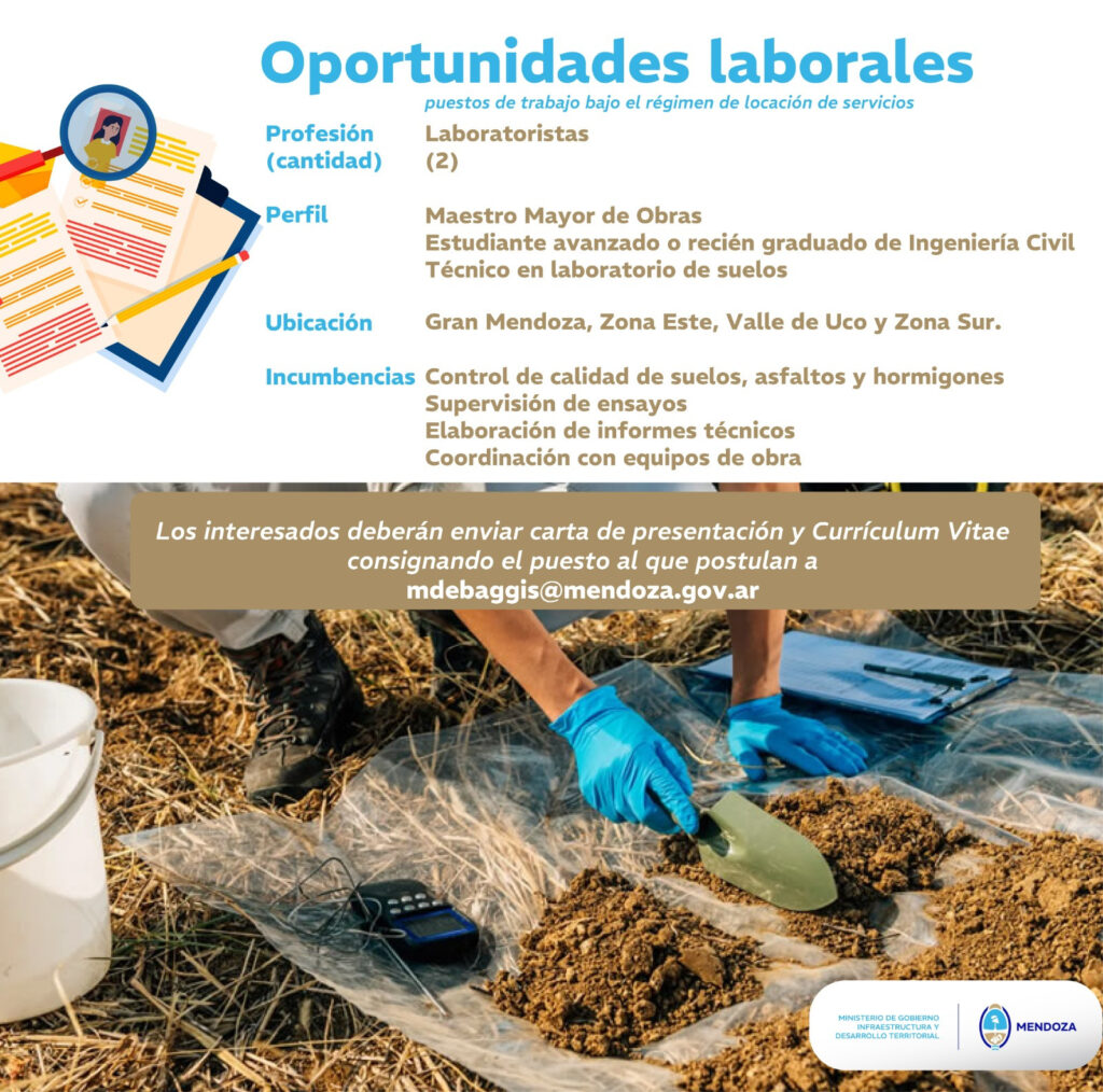 En la Subsecretaría de Infraestructura y Desarrollo Territorial estamos seleccionando profesionales con disponibilidad full time para trabajar en diversas obras públicas de la provincia. 👉 Se buscan perfiles en: * Laboratoristas * Agrimensores / Topógrafos * Sobrestantes * Técnicos en Seguridad e Higiene * Administradores de contratos * Jefes de inspección de obras viales y […]