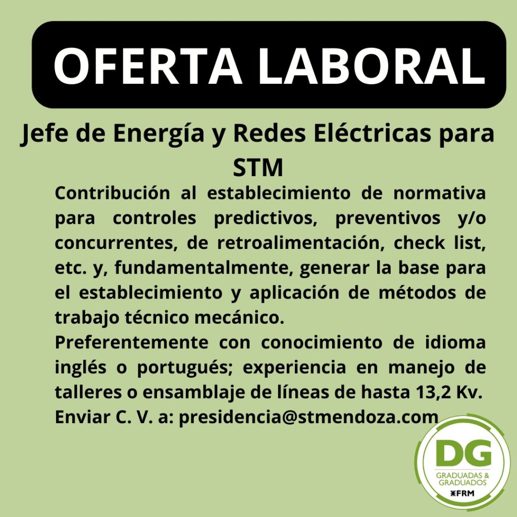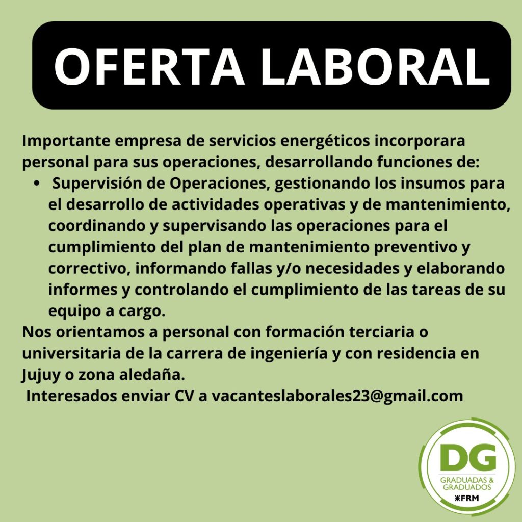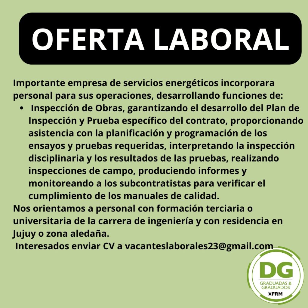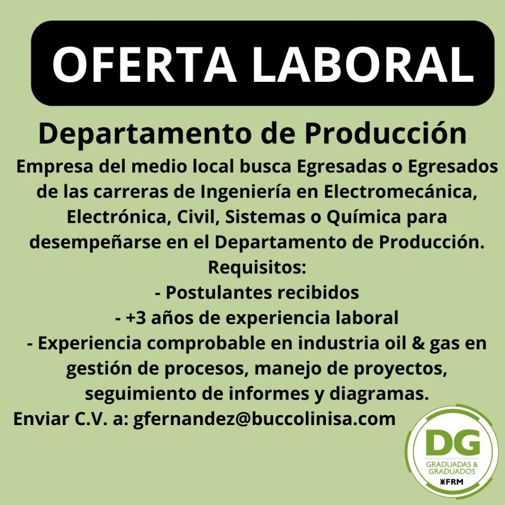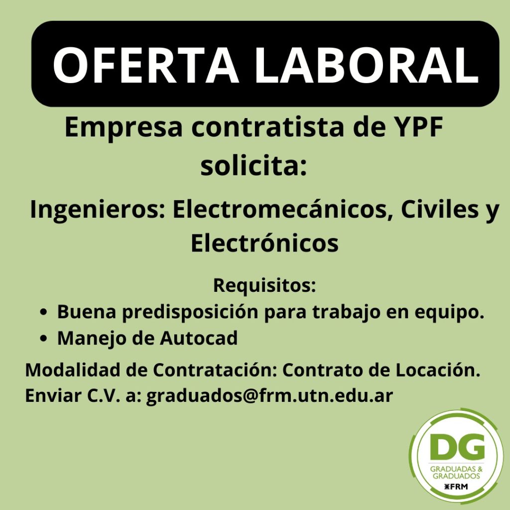 YPF busca egresados de las carreras de Ingeniería: Mecánica, Electromecánica, Eléctrica, Industrial, Química, Civil, en Materiales. Que cuenten con disponibilidad para viajar/reubicarte en aquellas ciudades donde se desarrollan nuestras obras: Neuquén, Comodoro Rivadavia, Bahía Blanca. Que manejen el Idioma Inglés en un nivel intermedio/avanzado. Que tengan disposición para trabajar en diferentes locaciones y un interés […]