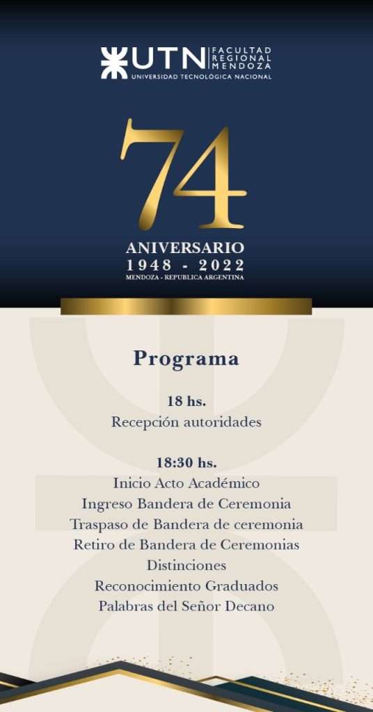 Estimadas graduadas y graduados: Los invitamos al acto en conmemoración al 74° aniversario de la UTN, en el cual se distinguirá a graduados que cumplen más de 50 años desde su graduación. El acto se realizará el día miércoles 17 de agosto de 2022 a las 18:00 hs.
