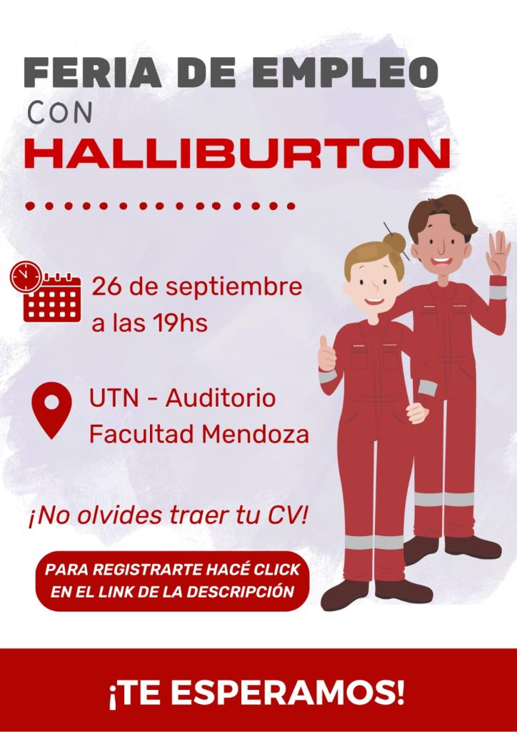 ¡Sumate a la Feria de Empleo junto a Halliburton en la UTN Mendoza! Te invitamos a registrarte ingresando al siguiente link https://forms.office.com/pages/responsepage.aspx?id=hna-t5dvt02QgaI88JqWte6buAf_8z5KvrAIEGKkx1FUNlowTVYwNVpERFVaSVI2NlBaUkU5TU1CQy4u&web=1&wdLOR=c3B7A426E-7146-4F8A-9559-BD48F4294C85