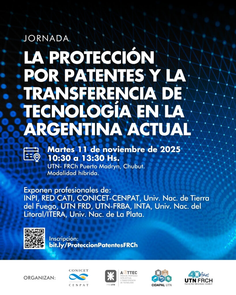 La Facultad Regional Chubut de la UTN, el CONICET-CENPAT y la UTN Regional Delta organizan un encuentro federal para compartir experiencias sobre propiedad intelectual, innovación y desarrollo tecnológico. Será el martes 11 de noviembre en la UTN-FRCh, con modalidad híbrida. La Universidad Tecnológica Nacional – Facultad Regional Chubut será sede de la jornada “La protección […]