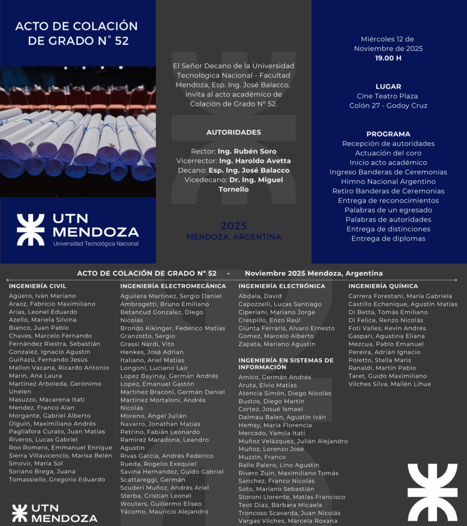 El señor decano de la Universidad Tecnológica Nacional Facultad Regional Mendoza, Esp. Ing. José Balacco, invita al acto académico de Colación de Grado N° 52 Programa Recepción de autoridades Actuación del coro UTN Inicio acto académico Ingreso Banderas de Ceremonias Himno Nacional Argentino Retiro Banderas de Ceremonias Entrega de reconocimientos Palabras de un egresado Palabras […]