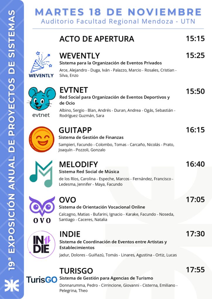 🎉💻 ¡Llega la 19.ª Exposición Anual de Proyectos de Sistemas de la UTN Mendoza! 🚀Una jornada imperdible donde nuestros futuros ingenieros e ingenieras presentarán 12 proyectos innovadores que van desde apps de gestión de eventos y finanzas 💼📲, hasta plataformas de participación ciudadana 🏙️, orientación vocacional 🎓 y análisis territorial 🌎. 📅 Martes 18 de […]