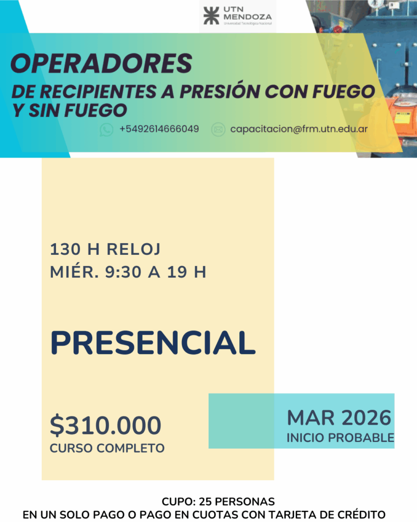 ✅Destinatarios: Profesionales del medio, operadores de recipientes a presión, público en general (primaria completa) ✅Metodología: Teórico-Práctico con visita de obra ✅Docentes: Profesionales UTN ✅Objetivo: Proporcionar al personal que opera en […]