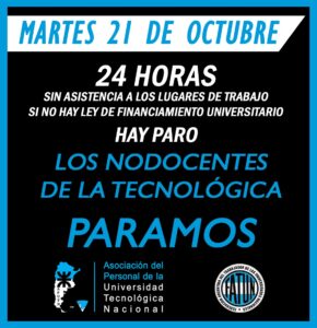 Por lo tanto, este MARTES 21 DE OCTUBRE, las y los trabajadores Nodocentes hacemos un PARO DE 24 HORAS SIN ASISTENCIA A LOS LUGARES DE TRABAJO.