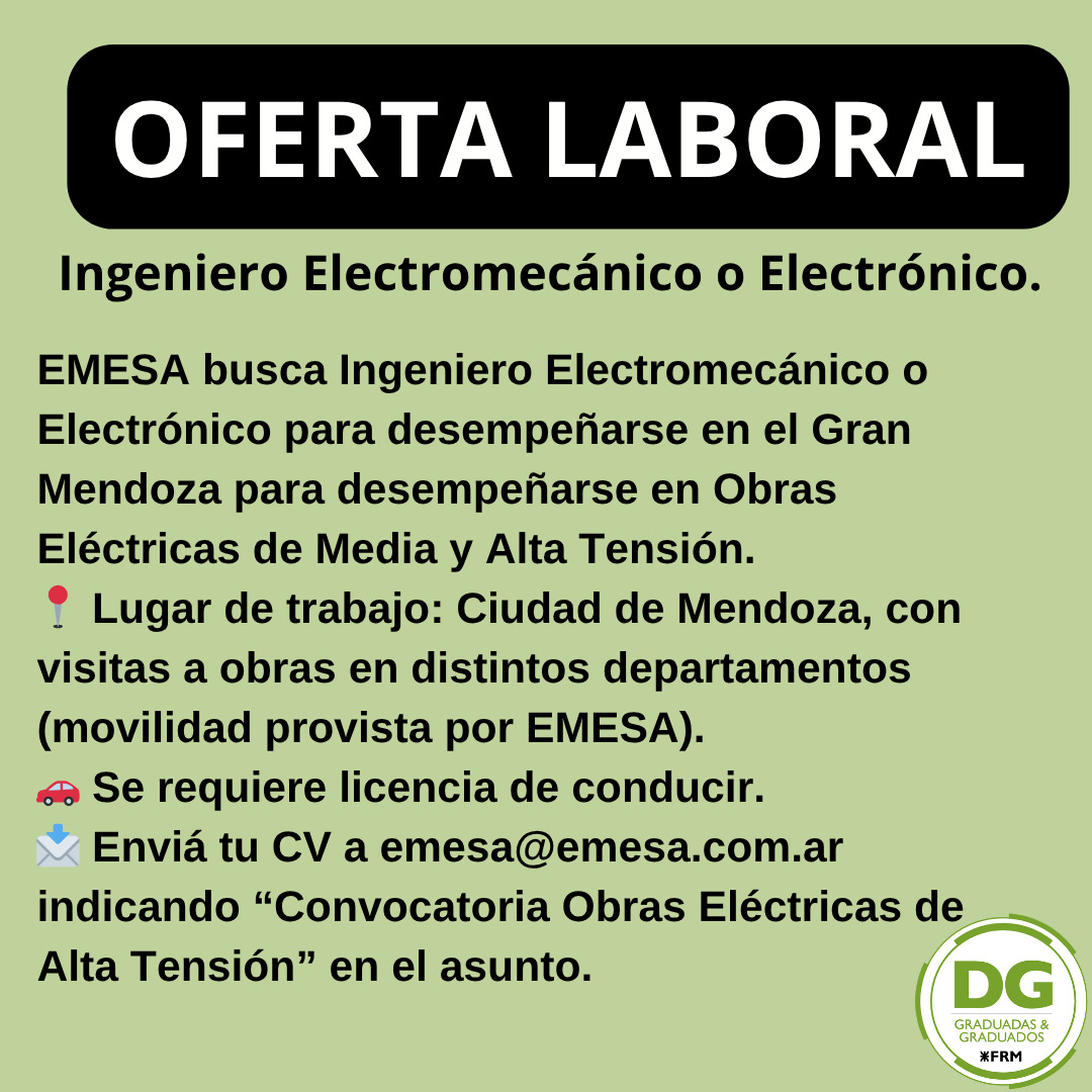 EMESA – Empresa Mendocina de Energía S.A. incorpora un/a profesional para brindar asistencia técnica en obras eléctricas de media y alta tensión, en el marco de los proyectos de infraestructura energética en los que colabora la compañía en la provincia de Mendoza. El puesto tiene por objetivo supervisar, coordinar y dar soporte técnico en las etapas de diseño de obras eléctricas de alta tensión; garantizando el cumplimiento de los estándares técnicos de calidad, seguridad y normativa aplicable.